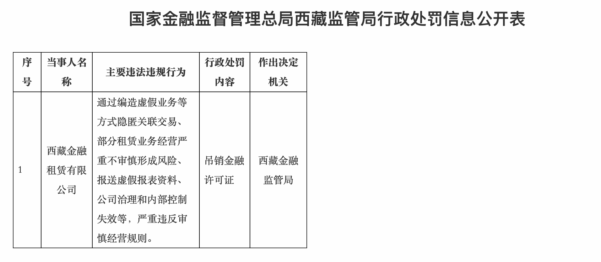一纸行政处罚决定,宣告了西藏金融租赁有限公司(下称"西藏金租")的终结,这家曾经创造"两年破百亿"规模奇迹的金租公司,最终因财务造假、违规经营等问题走向末路。